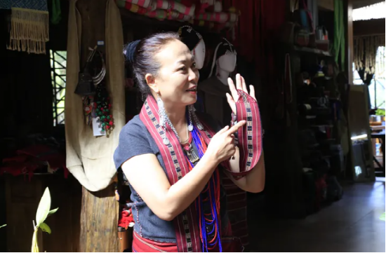 娜紅是勐梭鎮(zhèn)他朗村十組的老婦女主任,十多歲起開始學(xué)習(xí)佤族織錦技藝,隨后加入了李憲蘭工作室。“我靠織佤錦為家里織出了兩層樓房。”娜紅感恩佤錦技藝為家里帶來(lái)的改變,從前是白天勞動(dòng),晚上織布,一年只能賣得2000元。現(xiàn)在,每個(gè)月可以拿到3000元工資,年底還有分紅,日子越來(lái)越有盼頭。